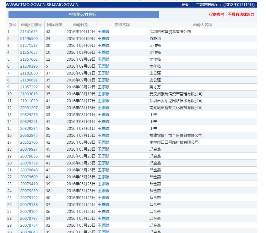眾所周知,明星的影響力是巨大的,尤其是他們自身的品牌效應(yīng),一舉一動都能為代言品牌帶來大量的關(guān)注。看到了自己的價值,越來越多的明星有了自己的品牌,甚至將自己的名字注冊為商標(biāo),將名字的商業(yè)價值發(fā)揮到了極致。前段時間注冊了王思聰?shù)拿趾蜕虡?biāo),也被搜到了。網(wǎng)友大呼土豪王思聰分分鐘買下商標(biāo)。